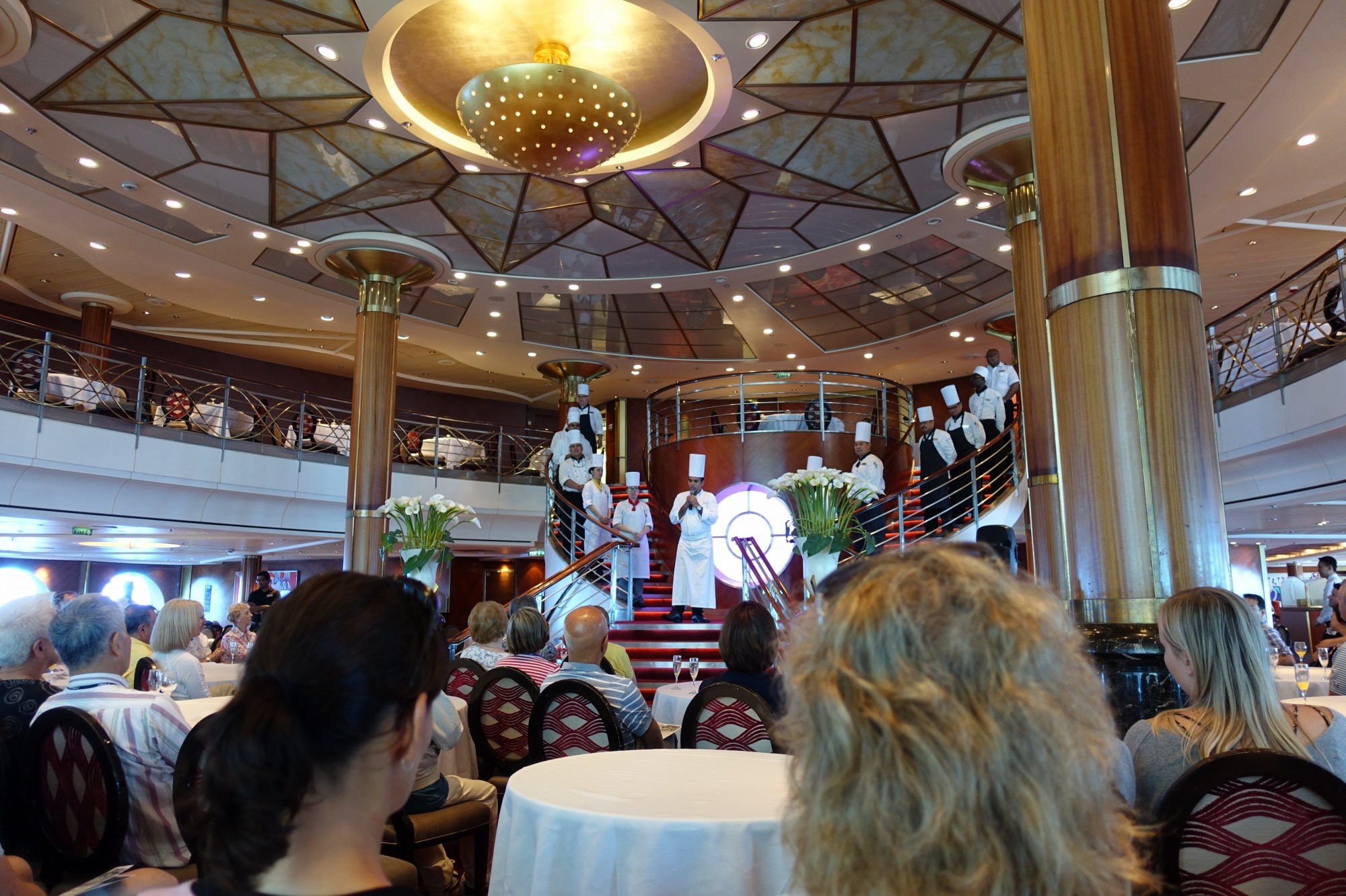 昨日ミュージカルを上演していた見覚えのあるキャストが壇上に座っています。皆いろいろなキャリアを積んで、この船に乗船されていました。また国籍もオランダやアメリカなどバラバラででした。