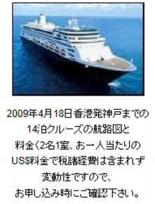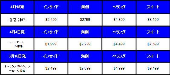 その後4月18日香港発中国・済州島(韓国)・神戸(日本)までのクルーズ(14泊と10月10日発は16泊)が