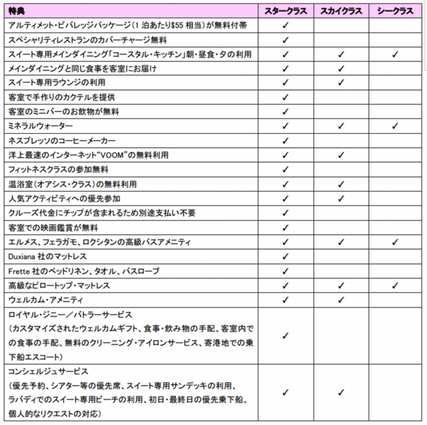 ロイヤル・スイートクラスは、スイート客室のカテゴリーにより、「スタークラス」、「スカイクラス」、「シークラス」と