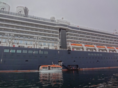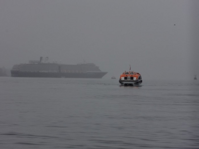 雲に隠れてうすく見えるウエステルダム号とテンダーボート。