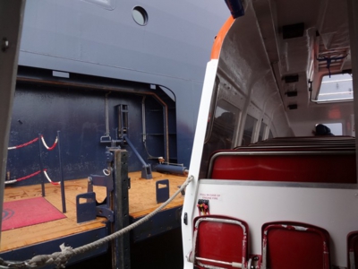 テンダーボートを船から降ろして、このように陸との輸送手段として利用します。