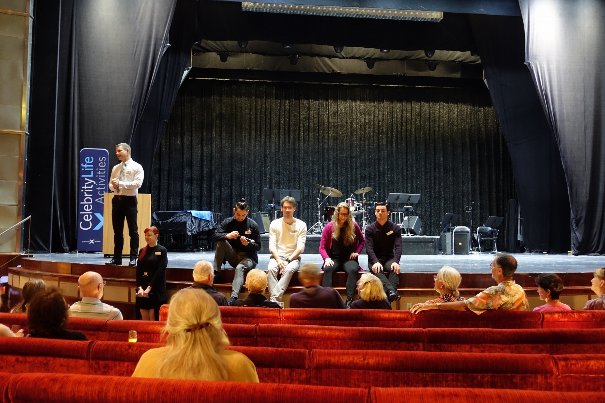 昨日ミュージカルを上演していた見覚えのあるキャストが壇上に座っています。皆いろいろなキャリアを積んで、この船に乗船されていました。また国籍もオランダやアメリカなどバラバラででした。