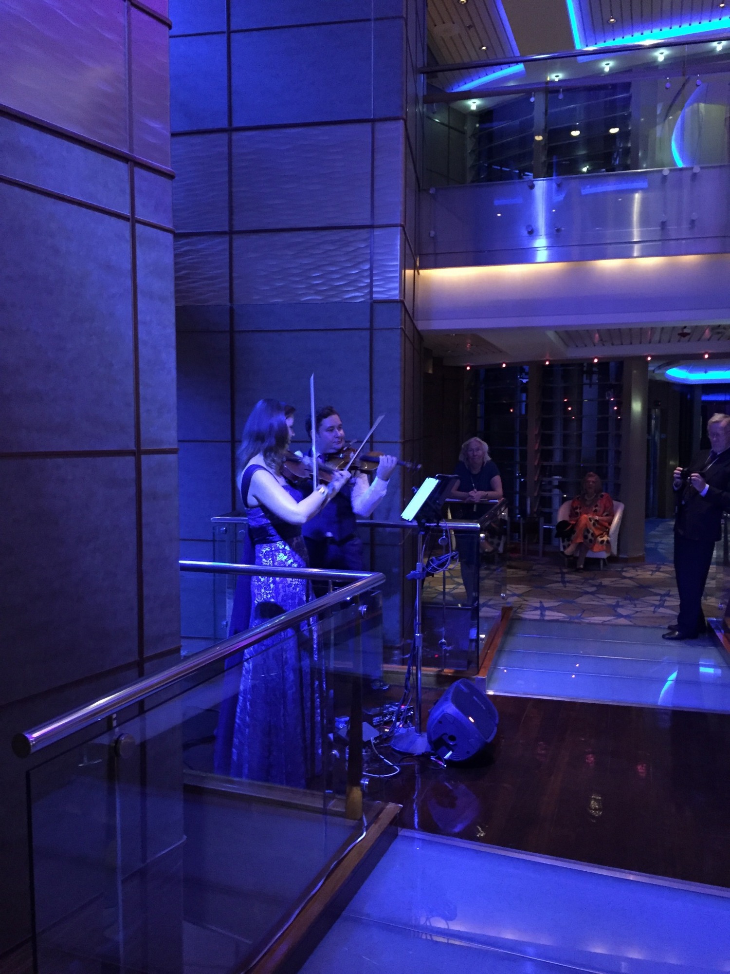 終日航海なので、船でのイベントについて書きたいと思います。ほとんどのクルーズ船で、シアターでのミュージカル、手品、演奏などがもようされてますが、それ以外の日もパブリックエリアやバーなどでも演奏などをしていることがあります。