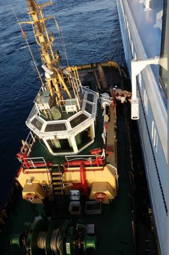 サララの港に着岸はせずに、沖合で停止しました。そこへ1隻のタグボートが近づいてくるではありませんか。