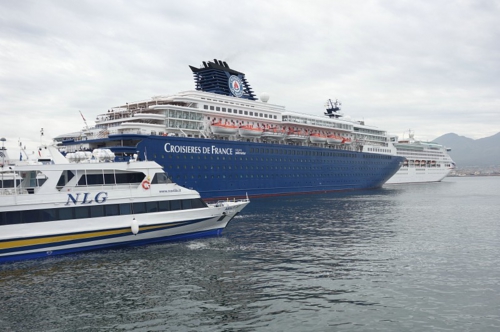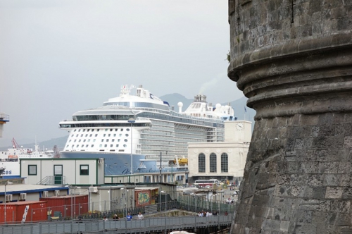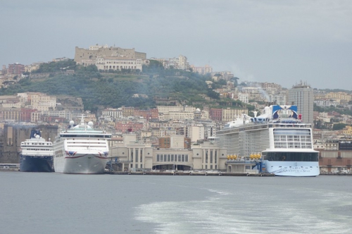 海から見た、ナポリの景色。左手奥の青い船がゼニス号、左手手前の船がP&OのOCEANA