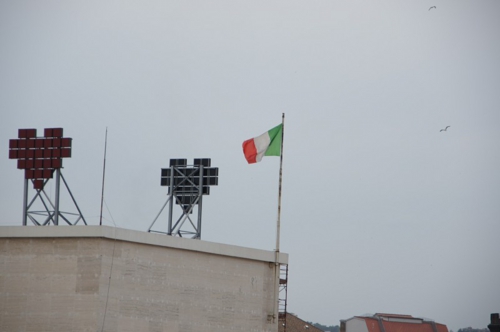 ナポリ港のターミナルの上にはイタリアの国旗とハートのオブジェが2つありました。