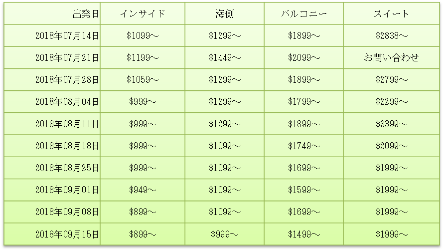 注)クルーズのみの代金で1部屋2名様でご利用の場合のお一人様料金(US$)です。