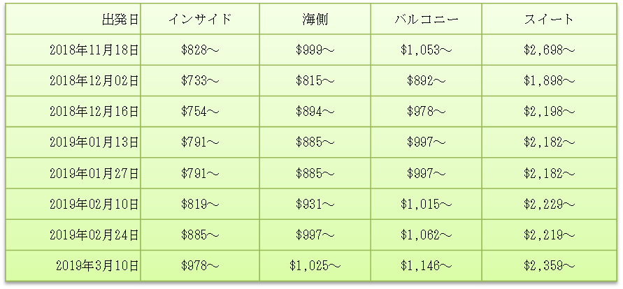 注)クルーズのみの代金で1部屋2名様でご利用の場合のお一人様料金(US$)です。