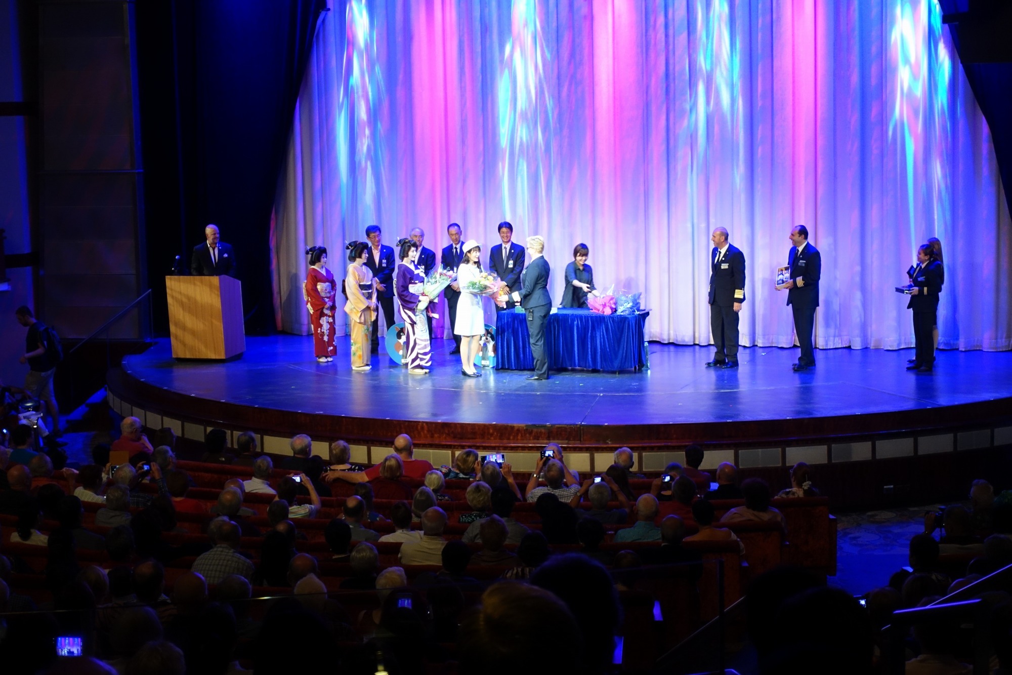 今晩の催し物は外国人が好きな芸者ショーだったのですが、実は昨日の清水でも芸者ショーだったらしく見逃したので行ってみることにしました。まあ、ショーは船内TVで再放送されるので、後日見たのですが、生での公演は日本にいても見る機会は殆どないのでいい経験でした。