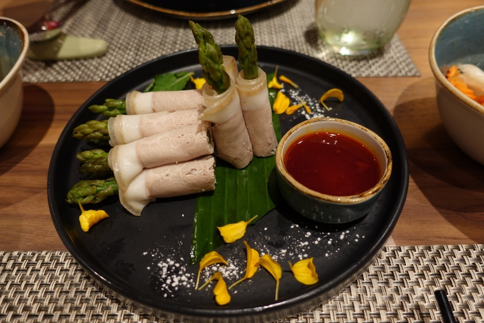 次は冷製の料理で、豚肉のアスパラ巻き・ガーリックソース添えです。